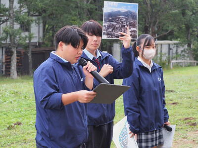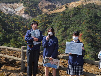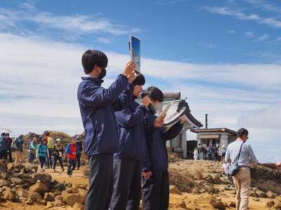 【本校にて御釜、刈田嶺神社奥宮、駒草平のガイドを行っている様子】