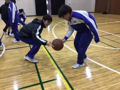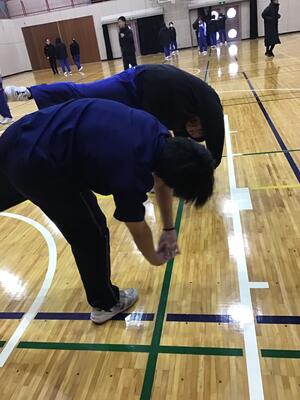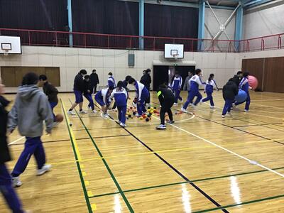 アイスブレイク、ミラーストレッチから始まり、ボールを自陣に集めるアクティビティを行い、最後のパイプラインでは全員で盛り上がることができました。ボールを自陣に集めるアクティビティでは人差し指のみでボールを自分の陣地に運ぶといったルールも課せられ、生徒たちは協力や工夫をしながら取り組んでいました。生徒たちは自然と集団で行動するためにはどのようなことが大切になるのかを学ぶことができました。